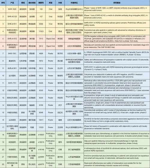 在肺癌、妇科肿瘤、淋巴瘤、膀胱癌、头颈肿瘤、黑色素瘤、肉瘤、鼻咽癌、脊索瘤、唾液腺癌、胸腺癌、硬纤维瘤、涎腺导管癌等其他多个疾病领域,卡瑞利珠单抗、阿帕替尼、阿得贝利单抗、吡咯替尼、达尔西利、氟唑帕利、法米替尼、SHR-1501、瑞拉芙普-α(SHR-1701)、SHR-1826、瑞康曲妥珠单抗(SHR-A1811)、SHR-A1912、SHR-A2102等抗肿瘤创新药相关研究一共入选了4项口头报告、2项快速口头报告、11项壁报展示和4项线上发表,彰显了九游会ag医药强劲的研发实力。此外,昂丹司琼口溶膜在防治化疗导致的恶心呕吐方面展现出了良好的疗效,本次ASCO年会有1项研究线上发表。