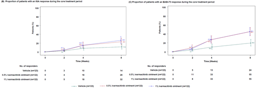 ● 第8周,0.5%艾玛昔替尼软膏组、1%组及赋形剂组的IGA应答率分别为21.3%、26.2%和10.6%。与赋形剂组相比,0.5%组和1%组的应答率差值分别为10.8%(p=0.0198)与15.6%(p=0.0013),差异均具有统计学意义。